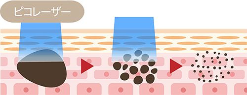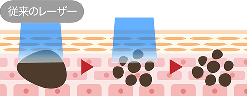 従来のレーザー治療は、熱作用が強い為、表皮や周辺組織に火傷などの症状が現れることがありましたが、ピコレーザーは照射スピードが早いため、熱作用が少なく、お肌へのダメージが少ない分、ダウンタイムが短く済みます。