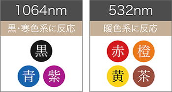 ピコレーザー「エンライトン」は、ピコ秒レーザーに加えて、黒・青・緑・紫の「1064nm」、赤・オレンジ・黄の「532nm」の2つの波長を搭載していますので、カラフルな色のタトゥーも除去治療が可能です。